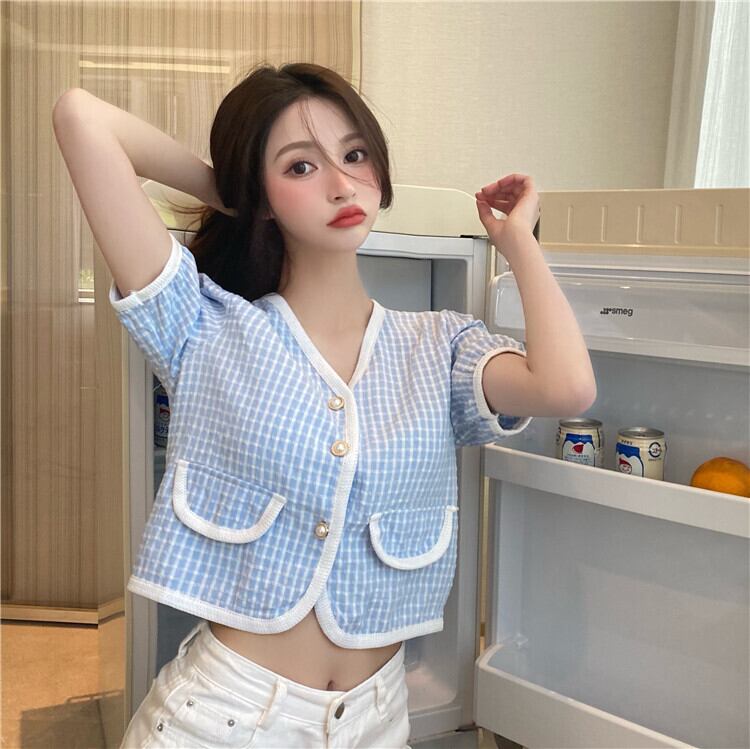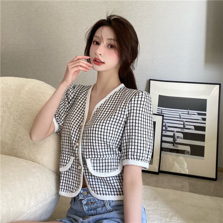 サマーVネック格子柄薄手ニットトップス レディース 夏物 ハンチェンe14435441845