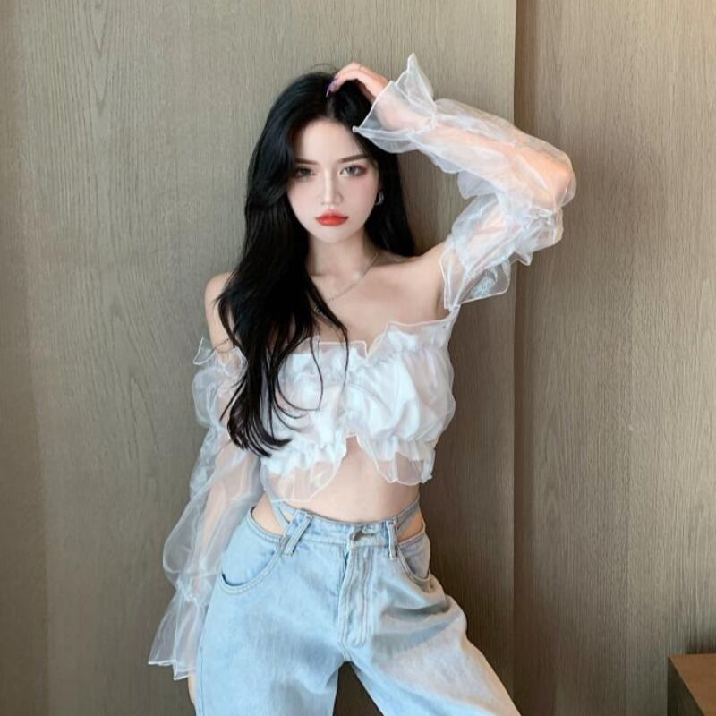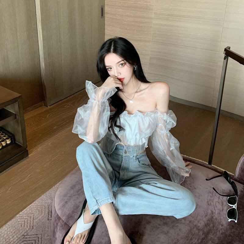 オータムメッシュスリーブトップス 秋物 オフショルダー ハンチェンe52375706461