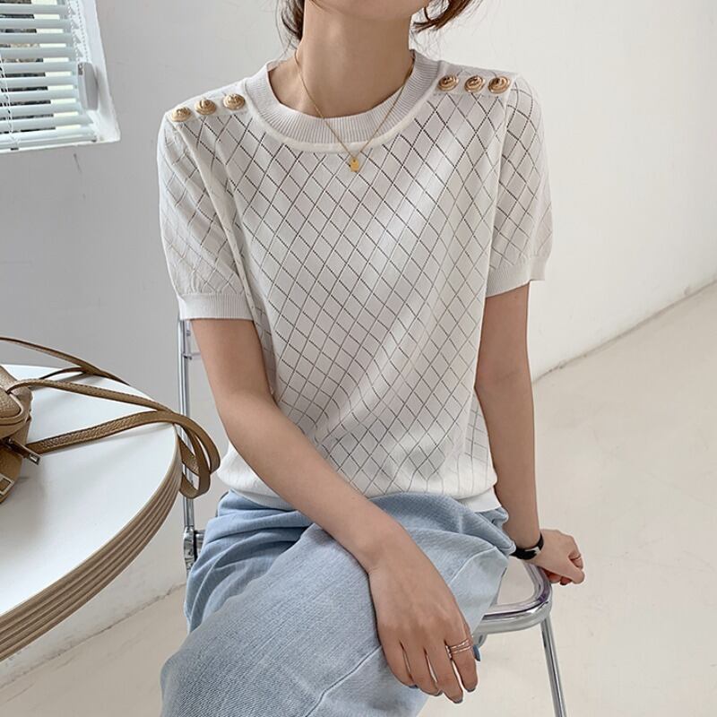 サマースタイルカジュアルニット薄手トップス レディース 夏物 シルク ハンチェンe92741906963