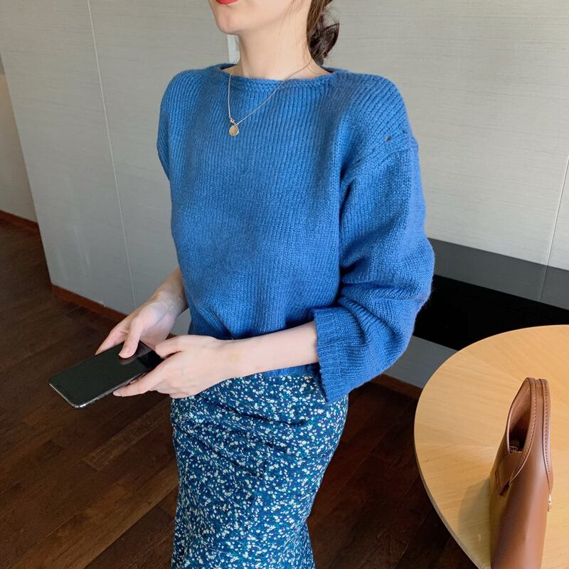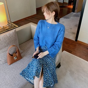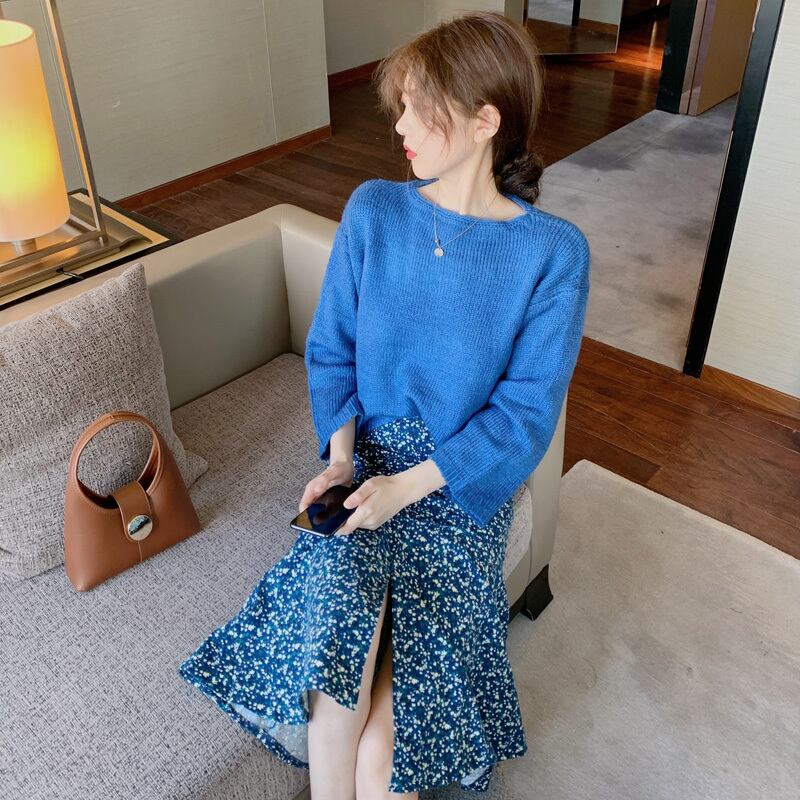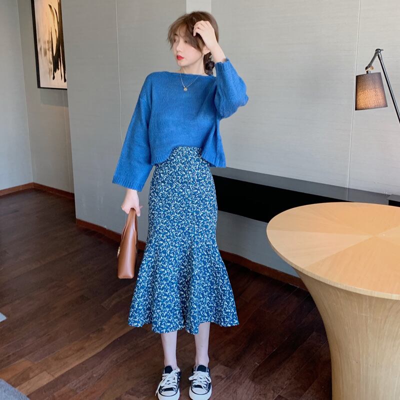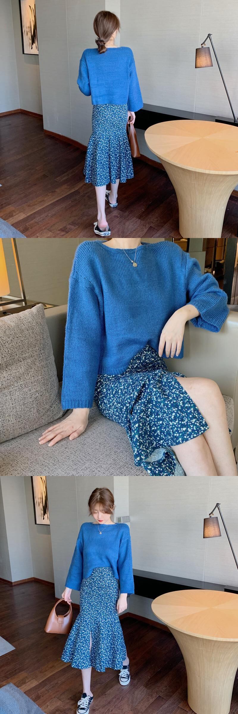 色:青いセーター,フローラルスカート