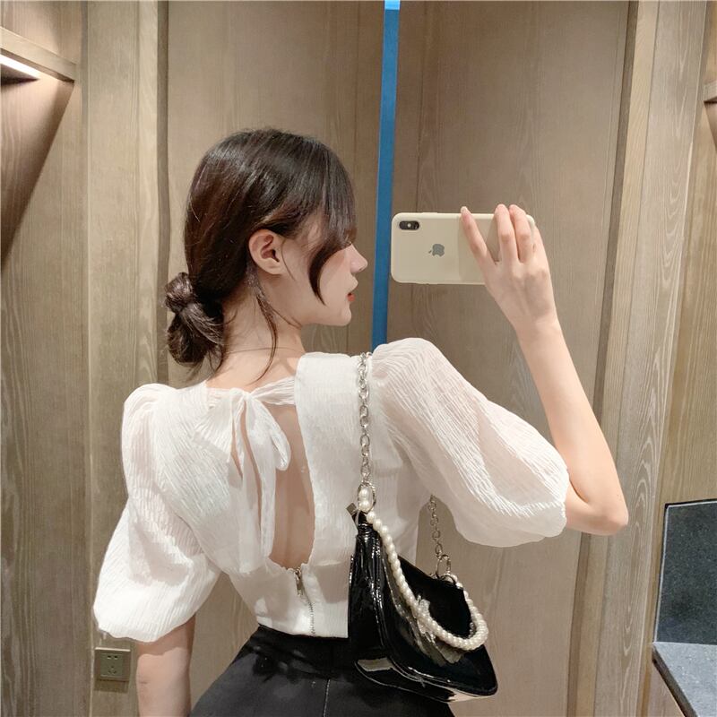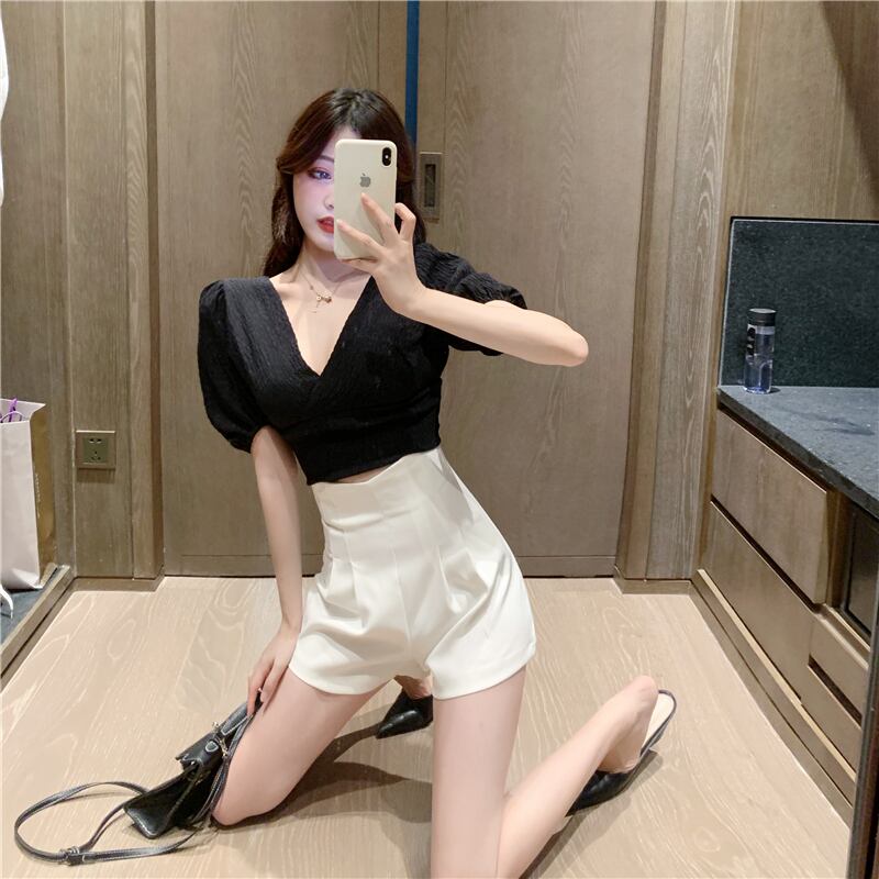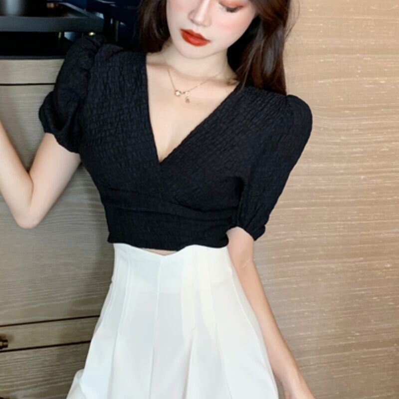シャツ レディースサマーVネックスリーブショートホルタートップス 夏物 ハンチェンe23298915235