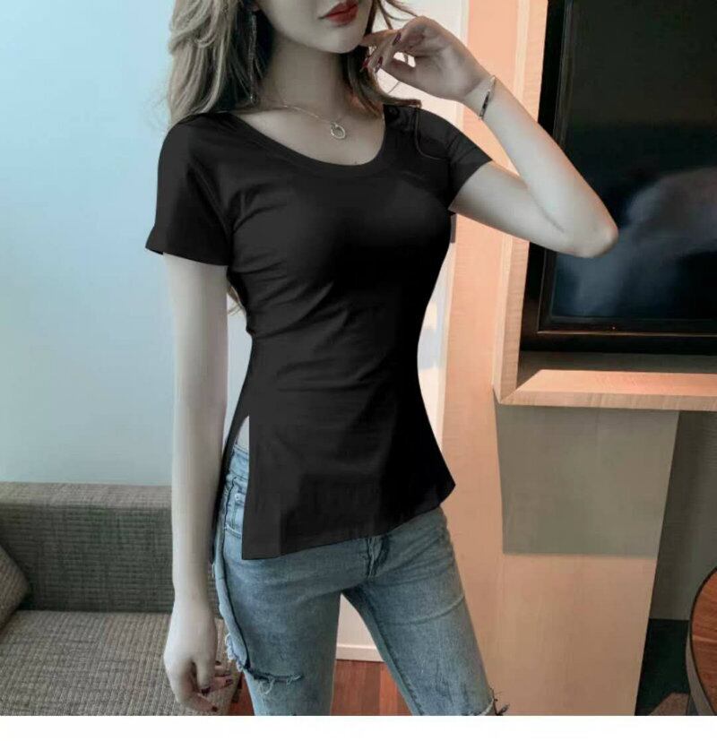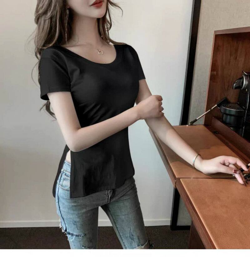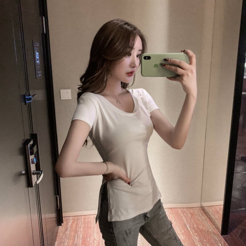 オータムサマースタイルホワイトブラウス サイドスリットウェストTシャツ シャツ スリム 夏物 秋物 ハンチェンe53431071369