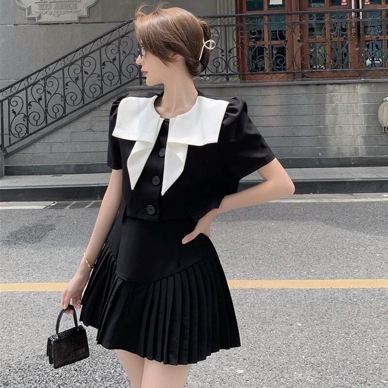 サマー半袖スリーブウェストプリーツスカート ショート ハーフスリーブ ストリート 夏物 ハンチェンe30357828821
