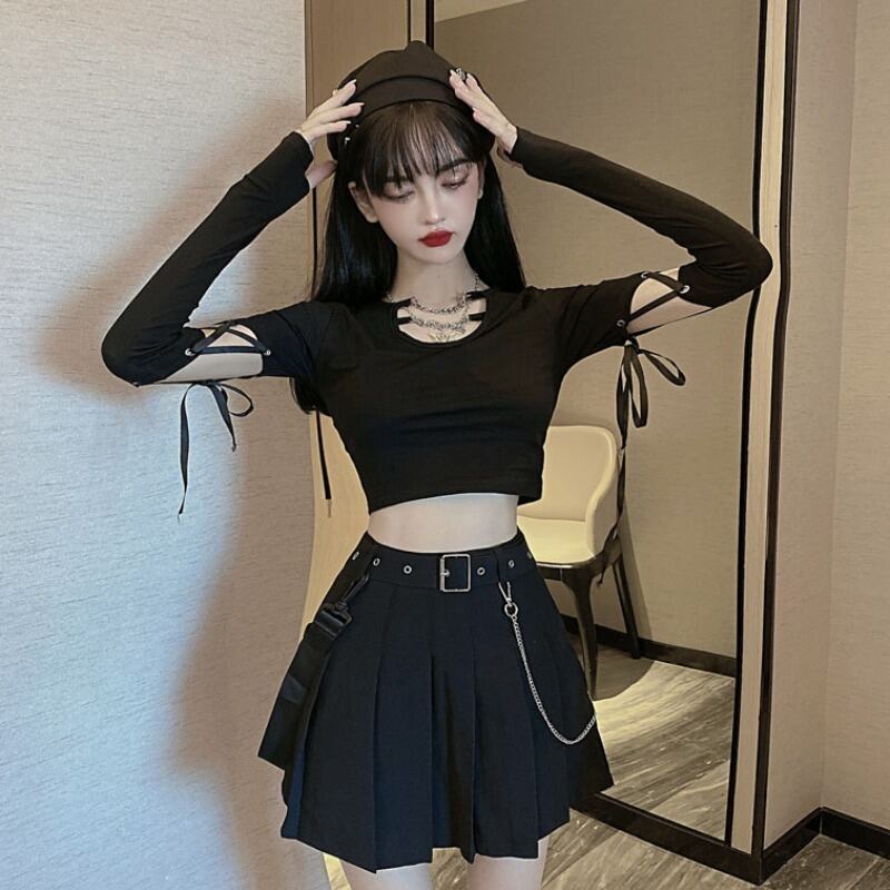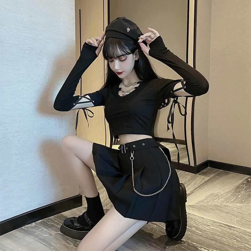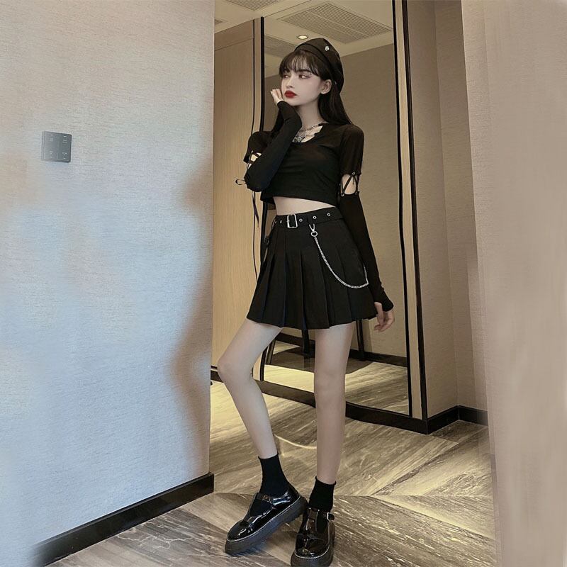 ダークチェーン ショートTシャツ ハイウェストプリーツスカート ロング ハンチェンe24177427358