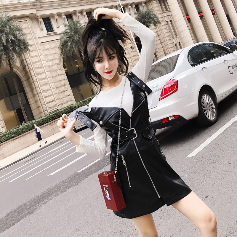 オータムスタイルレザースカート ホワイトニットトップス レディース ロング ストリート 秋物 ハンチェンe94347157272