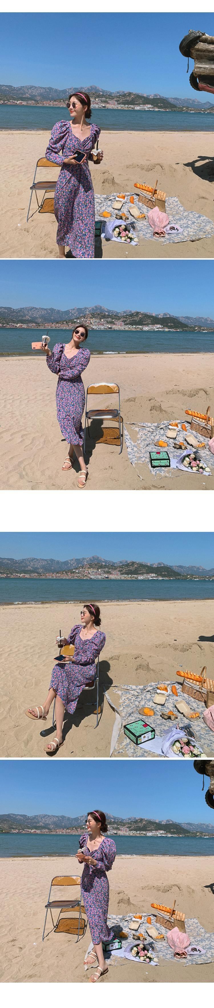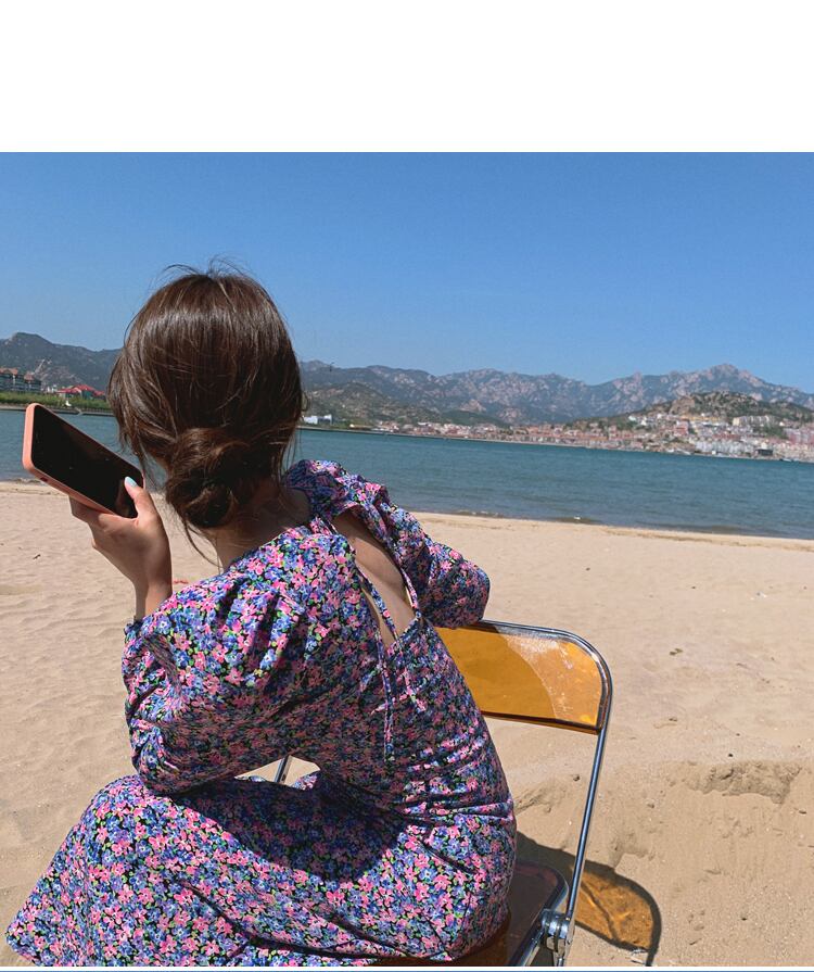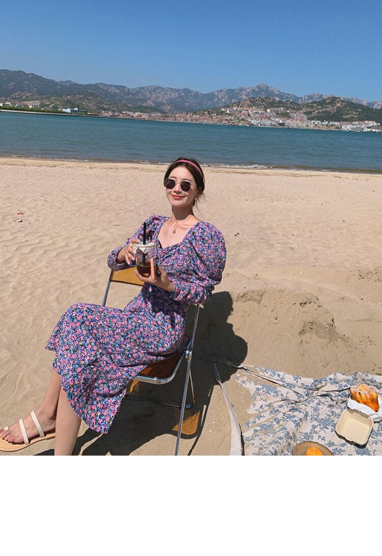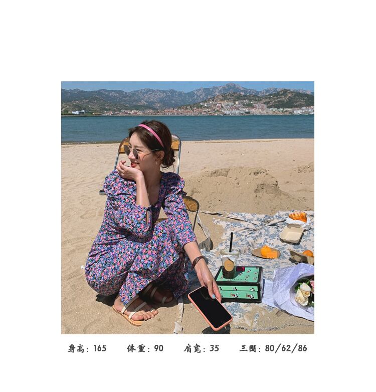オータムスタイルフローラルドレス スリーブスカート ランタンスリーブ 秋物 花柄 パープル スクウェア ハンチェンe34282244120