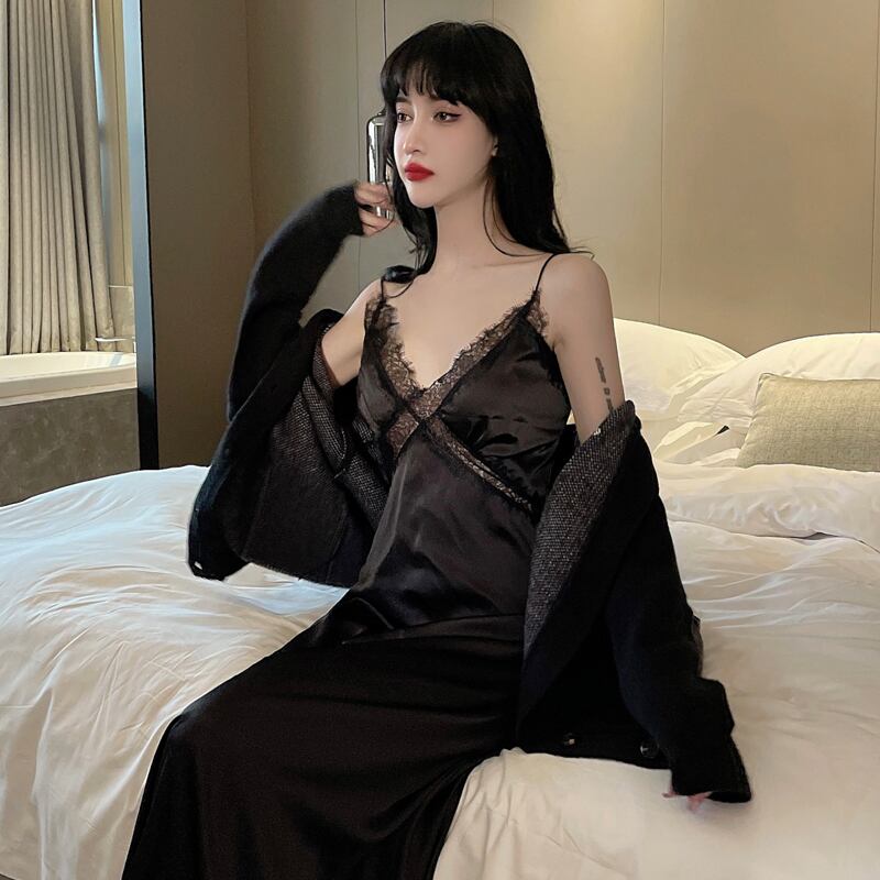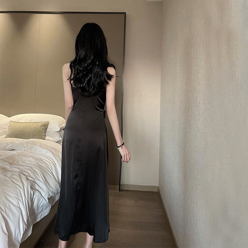スタンダードサテンVネックレースドレス レトロ シルキー ステッチ ハンチェンe11369370721