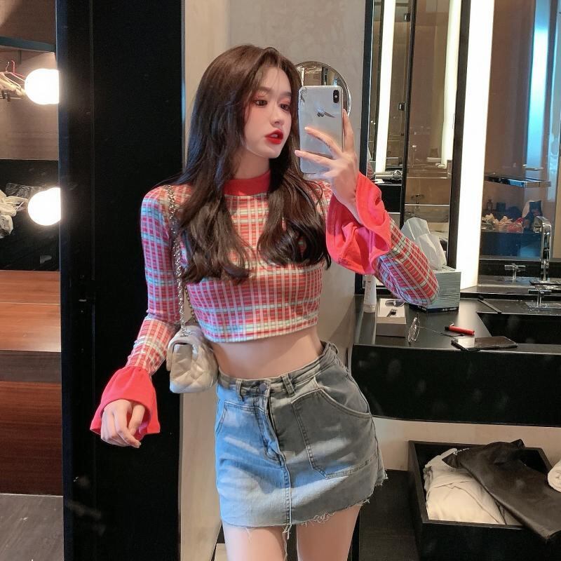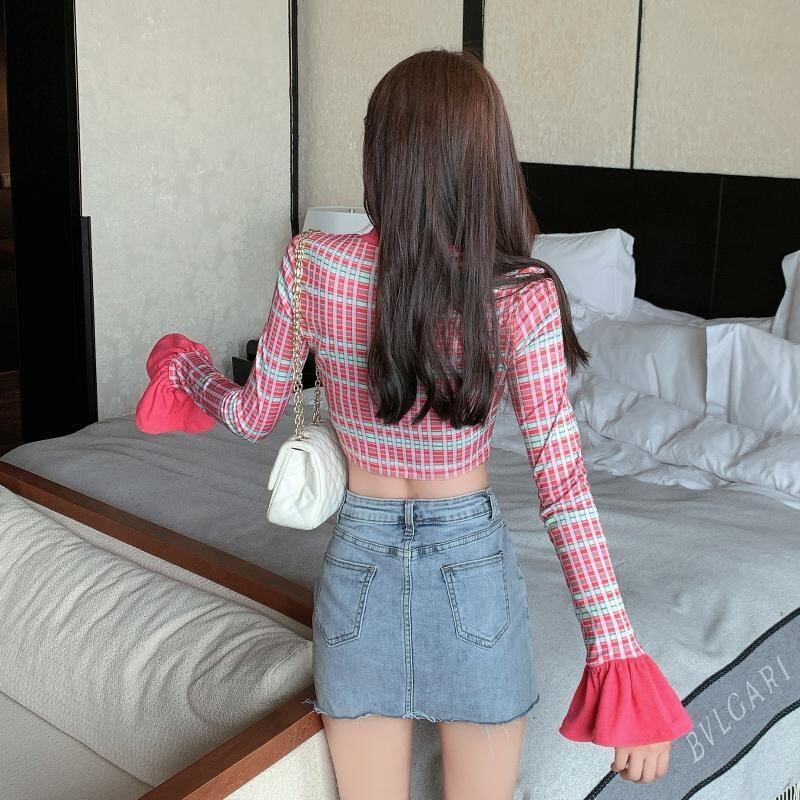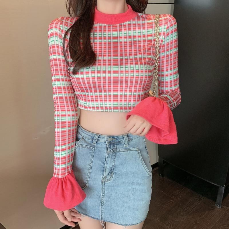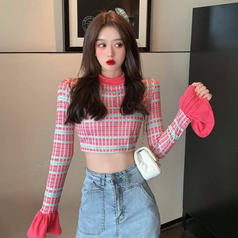 スタンダード格子柄Tシャツ オータムスタイルラウンドネックスリムショートトップス レディース ロング レトロ 秋物 Oネック ハンチェンe57162858690
