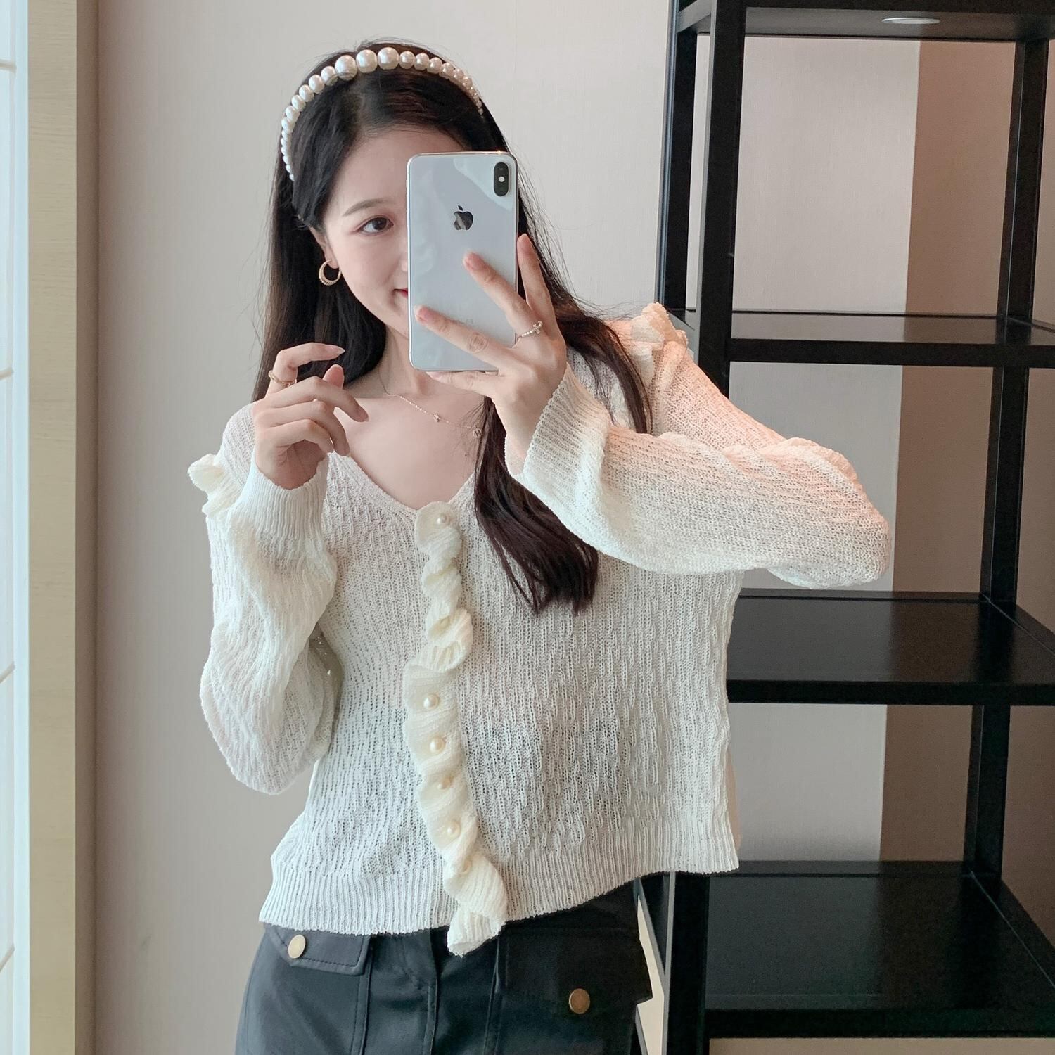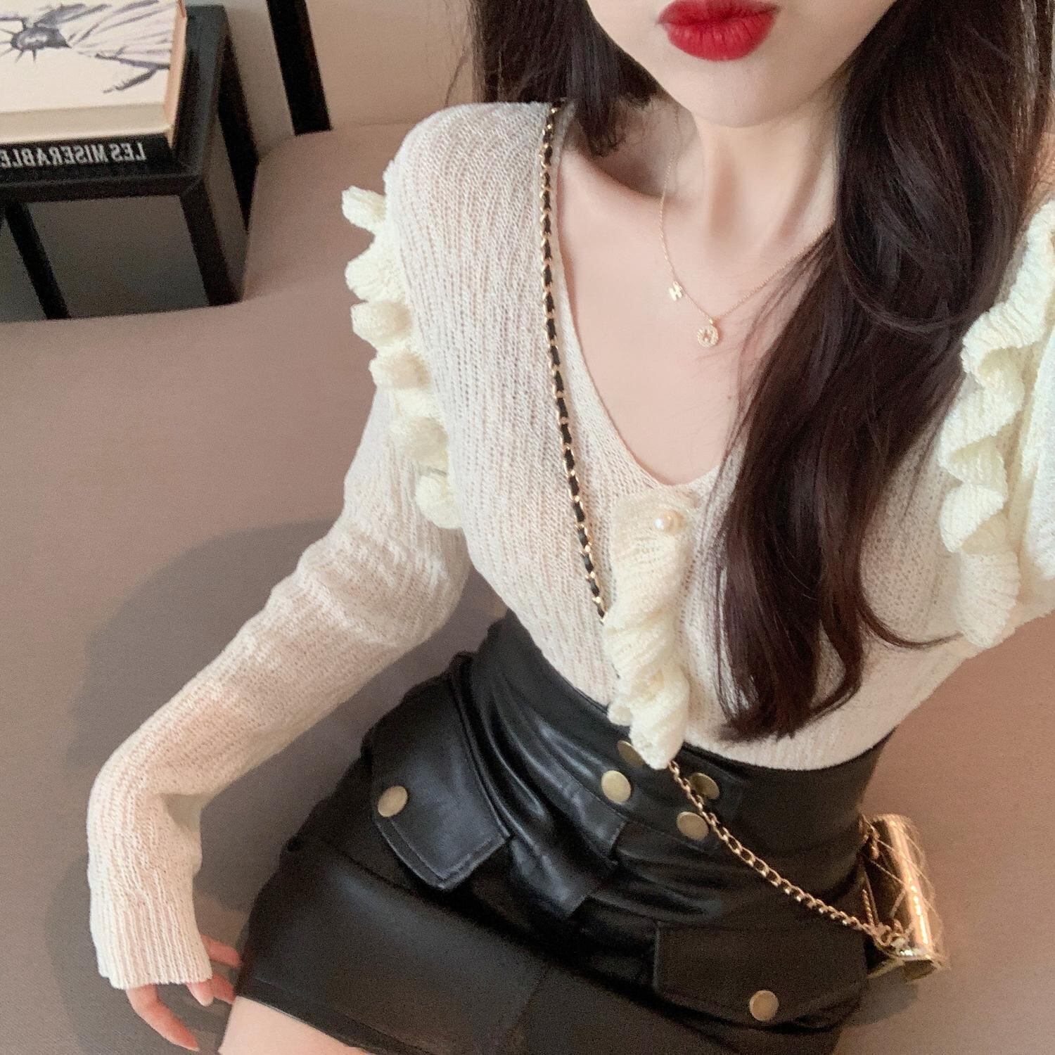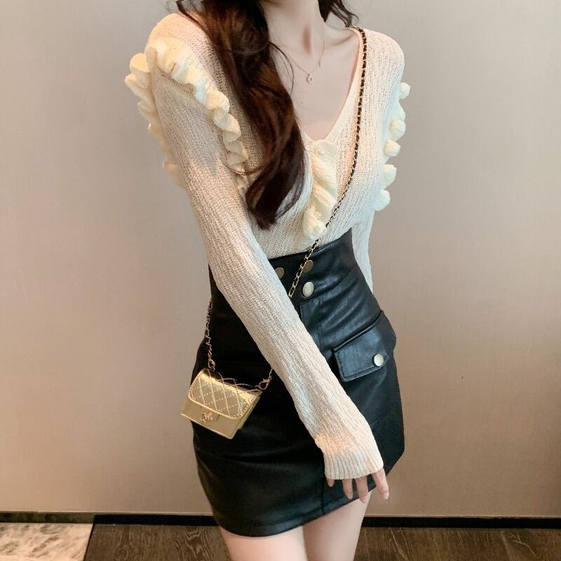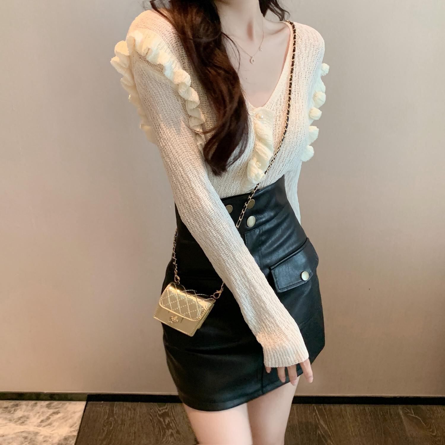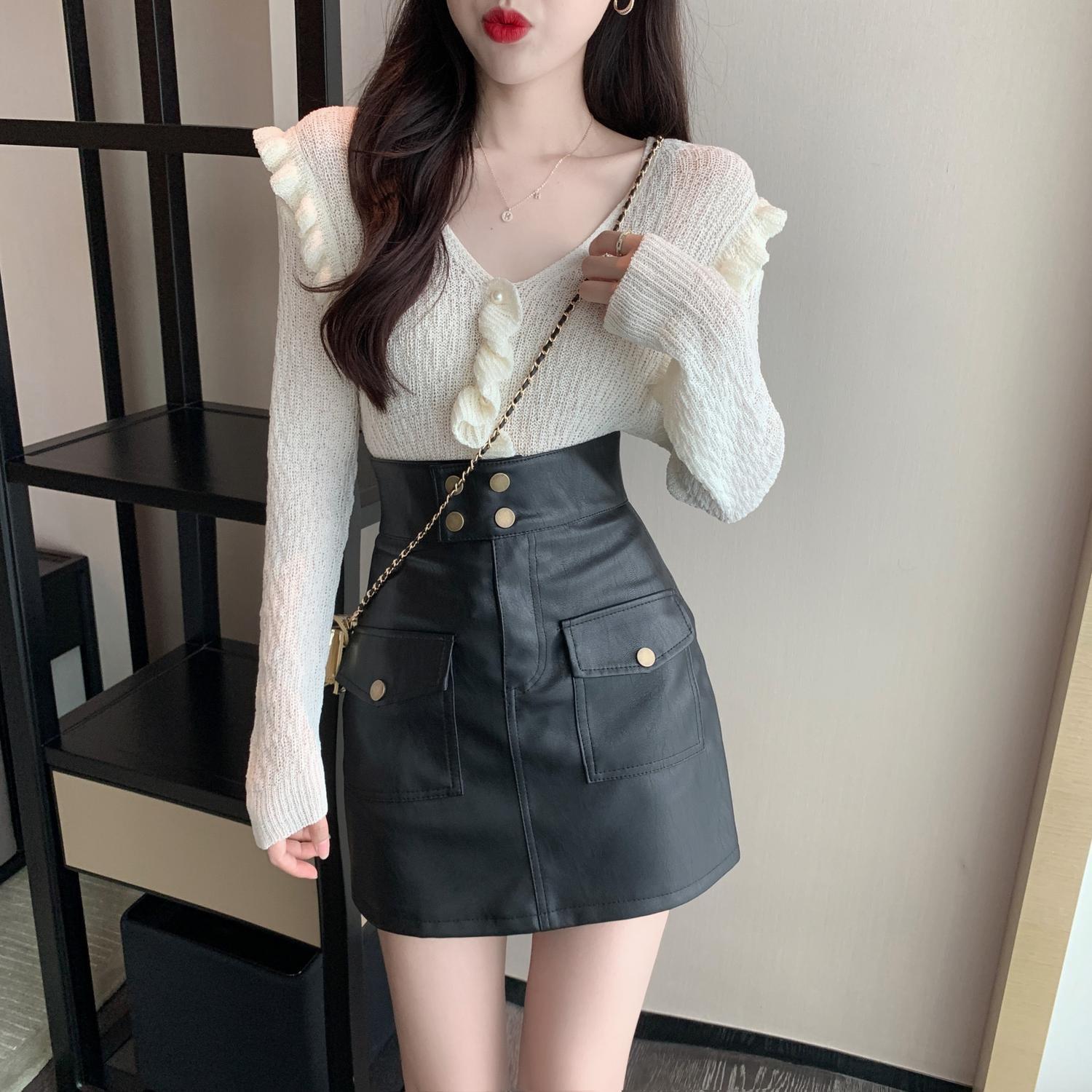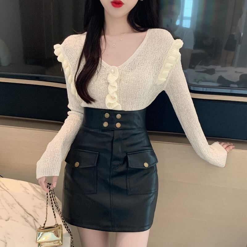 色:ホワイトトップ,黒革のスカート