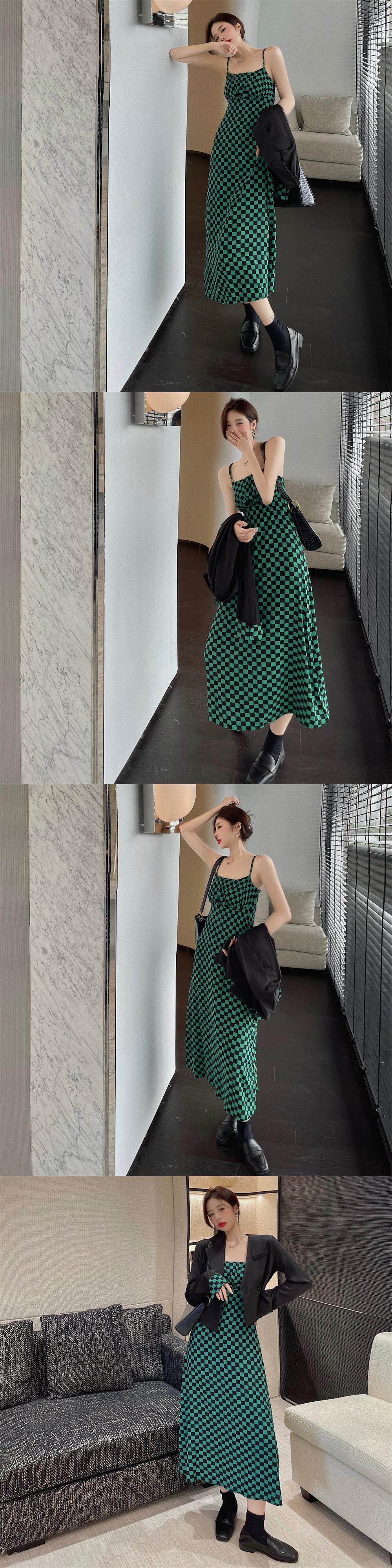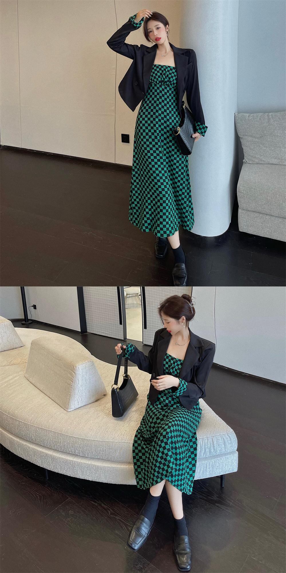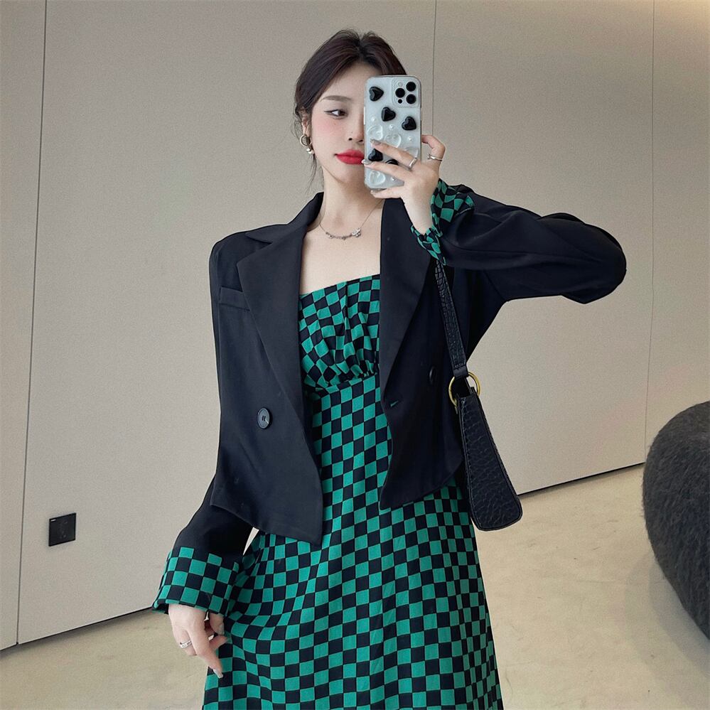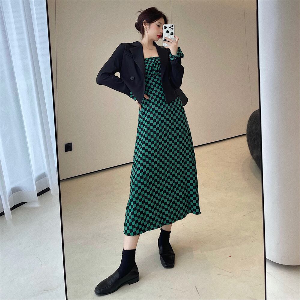 スタンダード格子柄ドレス ロングスカート ブラックショートジャケット オータムウィンター レトロ 秋物 冬物 ハンチェンe81355318007