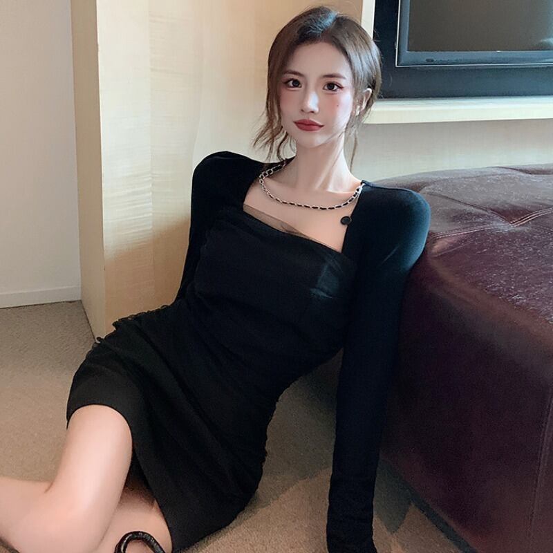 ドレス オータムウィンタースタンダードブラックホワイトカラーショートスカート レトロ 秋物 冬物 ハンチェンe67586067847