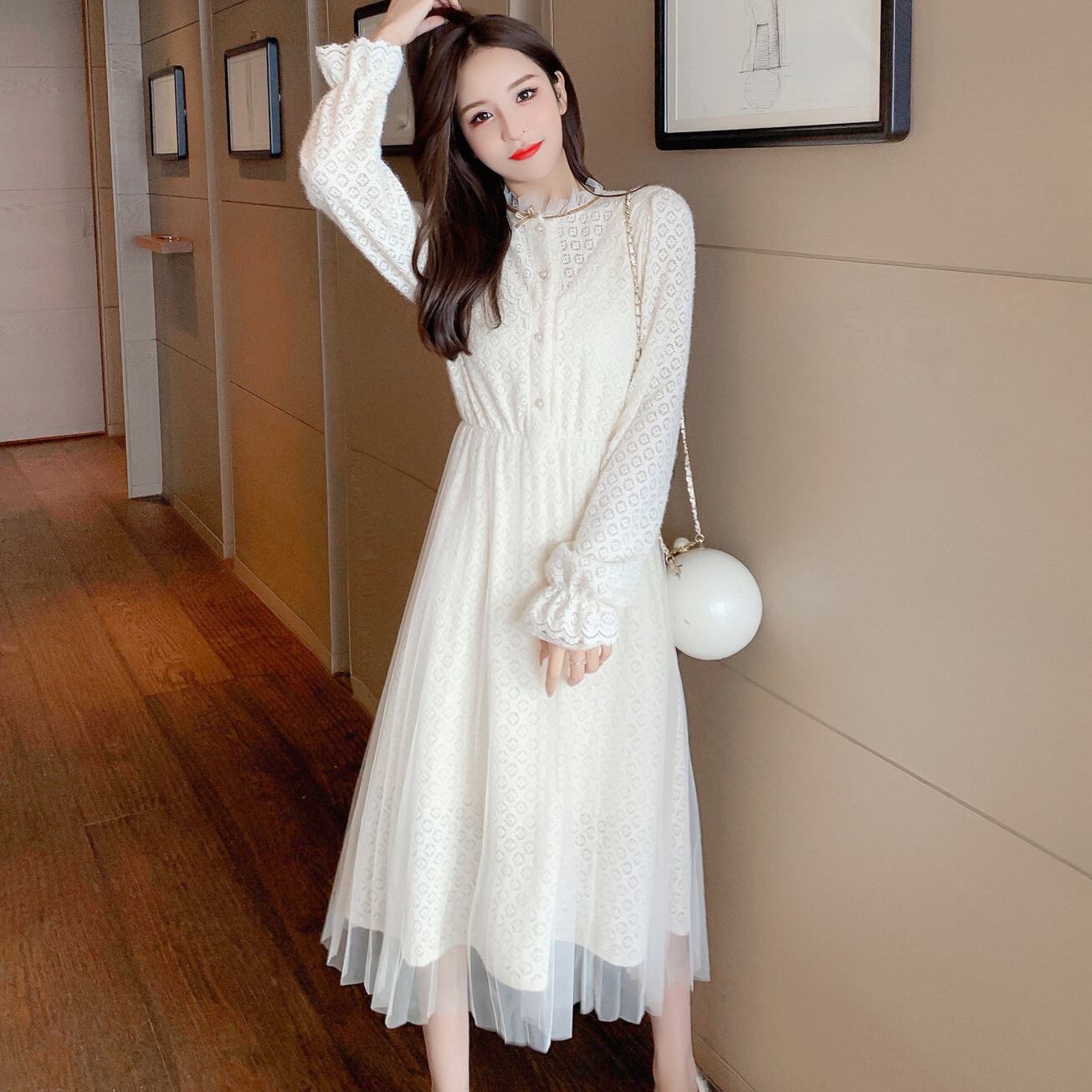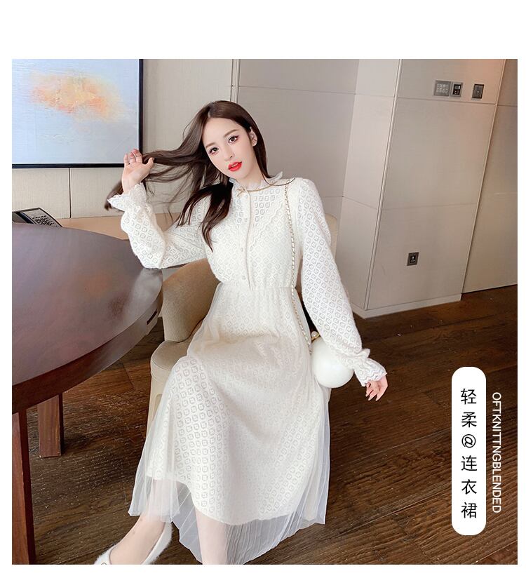 オータムウィンターウェストメッシュベルベットレースドレス 秋物 冬物 ステッチ ハンチェンe32641671192