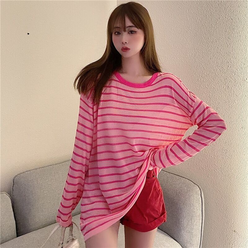 サマースタイルストライプシャツ 薄手ニットセーター トップス レディース ロング 夏物 ハンチェンe73130380117