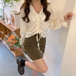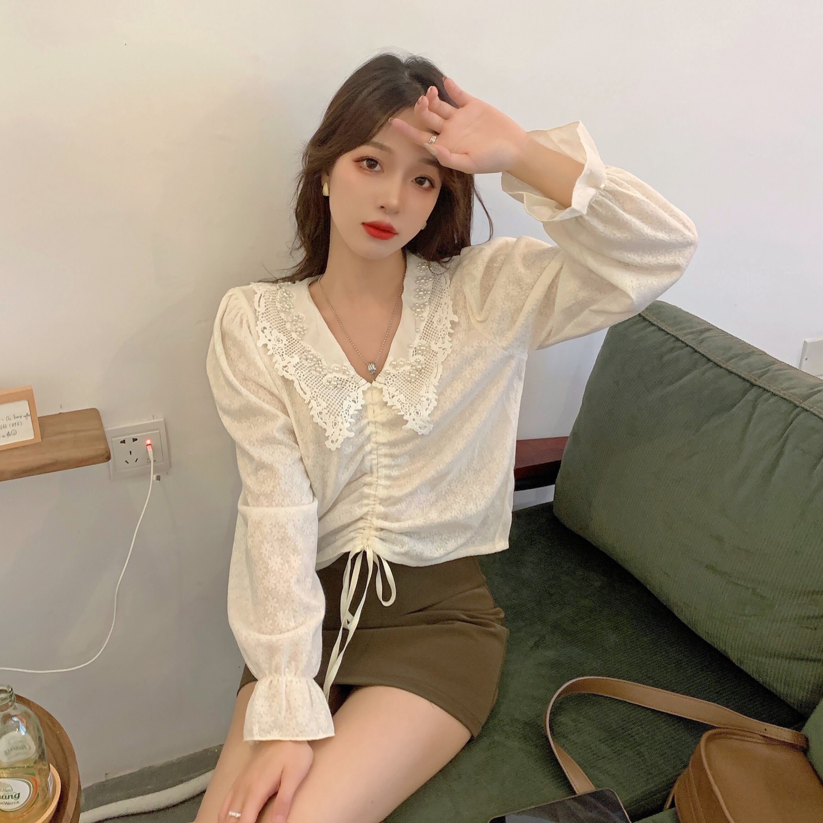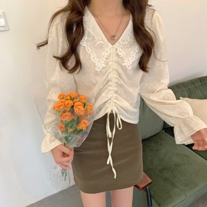 レースカラー長袖スリーブシャツ ギャザートップス レザースカート セット ロング レッド レースアップ ハンチェンe39456833858