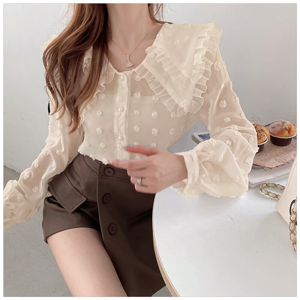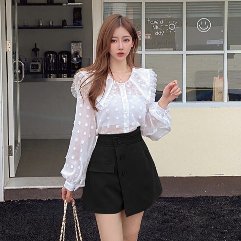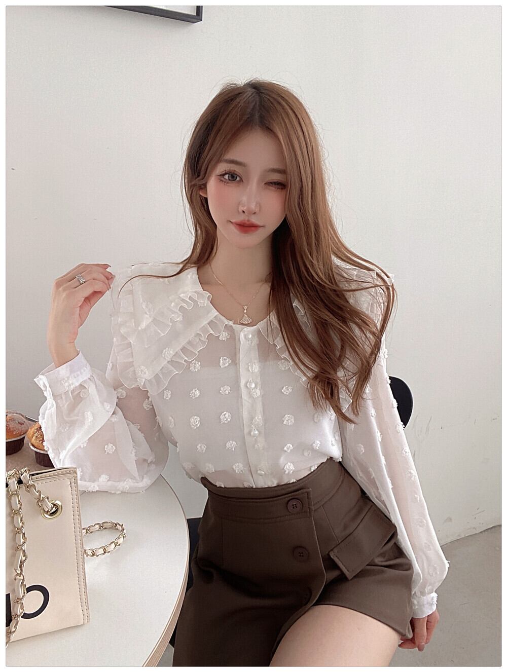カラーホワイトシフォンシャツ トップス スリムハイウェストウェストAラインスタイル ロング ハンチェンe13091243697
