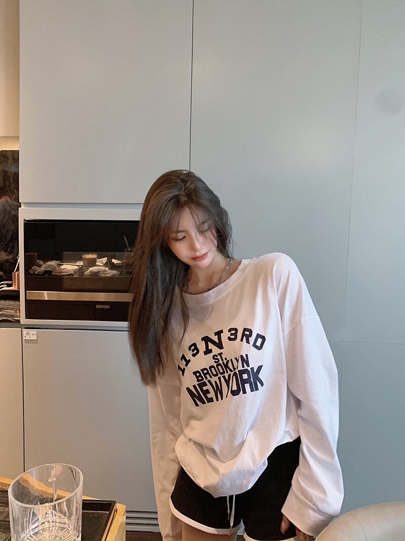 オータムウィンターカジュアルルーズプリントラウンドネック長袖スリーブレッドTシャツ トップス ロング 秋物 冬物 Oネック ハンチェンe41199897087